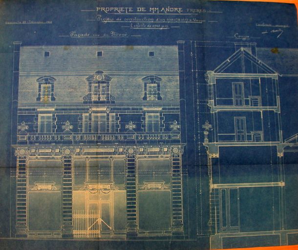Projet de construction du magasin André décembre 1920 : élévation de la façade sur rue. AM Vannes 2D2 Dossiers des séances du conseil municipal.Immatriculation