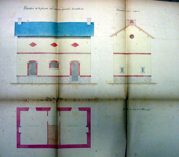 Elévation de la façade postérieure sur les quartiers d'artillerie du pavillon d'octroi route de Nantes par E. de Lamarzelle, 1879. AM Vannes 1M197 bureaux d'octroi.Immatriculation