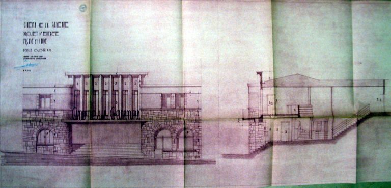 Projet de construction d'une entrée avec foyer-bar et de mise en conformité par Guy Caubert de Clery, 1951 : élévation de la façade sur rue. AM Vannes 1I128.Immatriculation