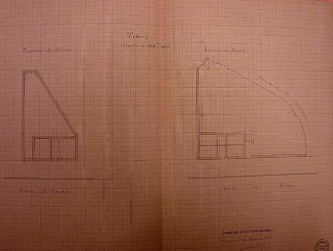 Plan au sol des premiers bureaux d'octroi route de Rennes et Nantes. AM Vannes 1M 197 Bureaux d'octroi.Immatriculation