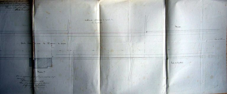 Plan dressé pour une demande d'alignement de Mr Mahonas, fermier de Mr Bourdonnais avec figuration d'une maison dite Maison-Neuve sur le cadastre appartenant à Martine jeune, le 21 mai 1851. AD Morbihan S257.Immatriculation