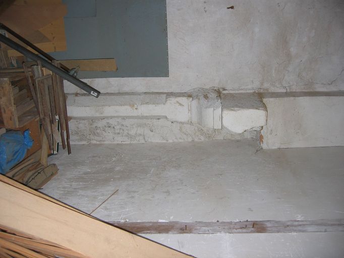 Pavillon, second étage, cheminée du mur est, vestiges, piédroit gauche.Immatriculation