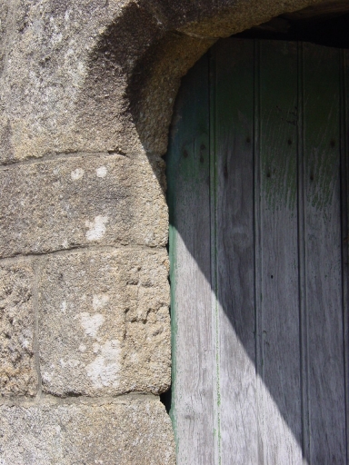 Ferme n°1, détail porte sud et monogramme IHS gravé dans l'ébrasement gauche.Immatriculation
