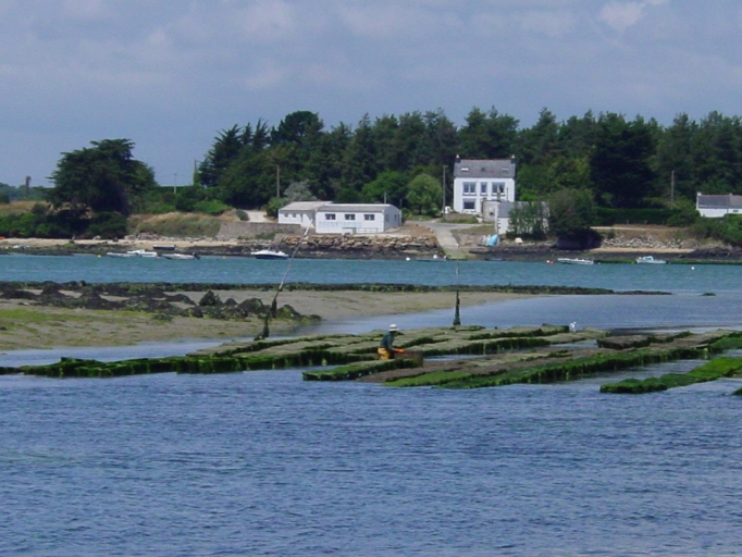 Parcs à huîtres à l'ouest de l'île de Saint-Cado, dans le chenal du Morvan. Elevage en poches sur tables immergées.Immatriculation