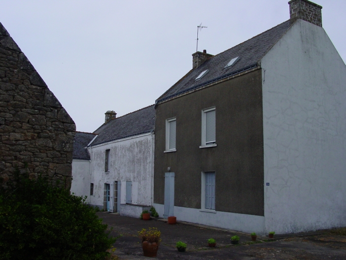 Ferme n°4. Au premier plan le logis remanié vers 1950, à l'arrière plan le logis étable ancien et les dépendances ouest.Immatriculation