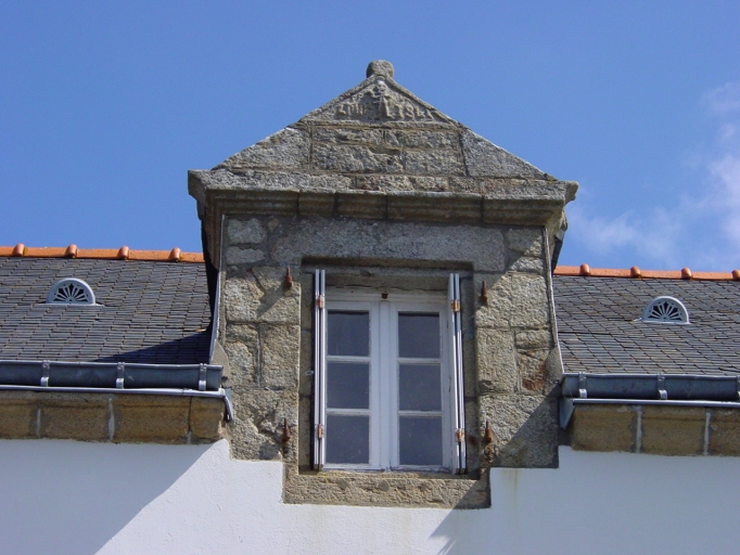 Logis de la ferme repérée, façade sud, détail lucarne axiale.Immatriculation