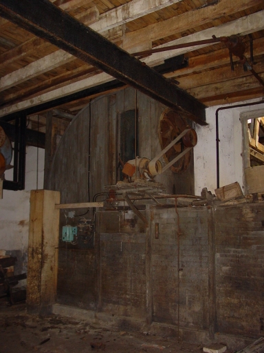 Grande halle, vaisseau ouest : Le séchoir à air chaud et son tunnel en bois.Immatriculation