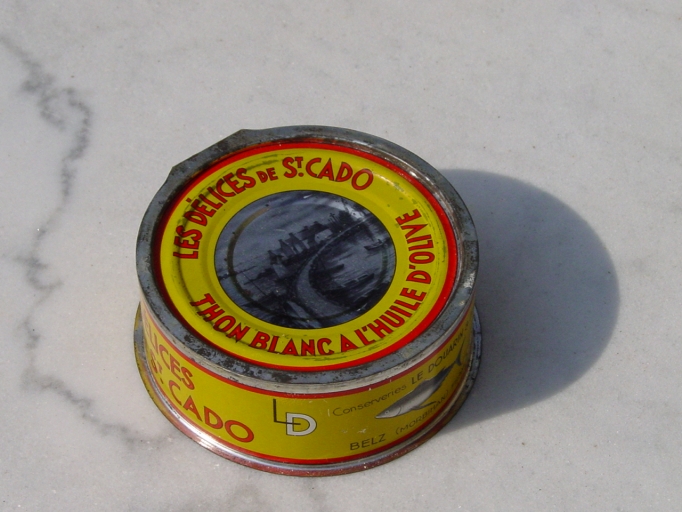 Spécimen de boîte de thon blanc à l'huile. Un paysage représentant l'île de Saint-Cado figure sur le couvercle. Fabrication chez Carneau Basse-Indre (Loire-Atlantique).Immatriculation