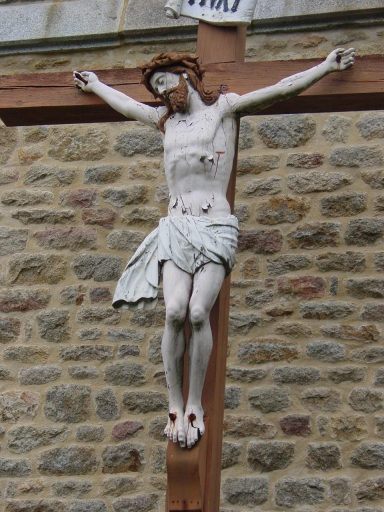 Détail Christ en croix en bois sculpté, peint.Immatriculation