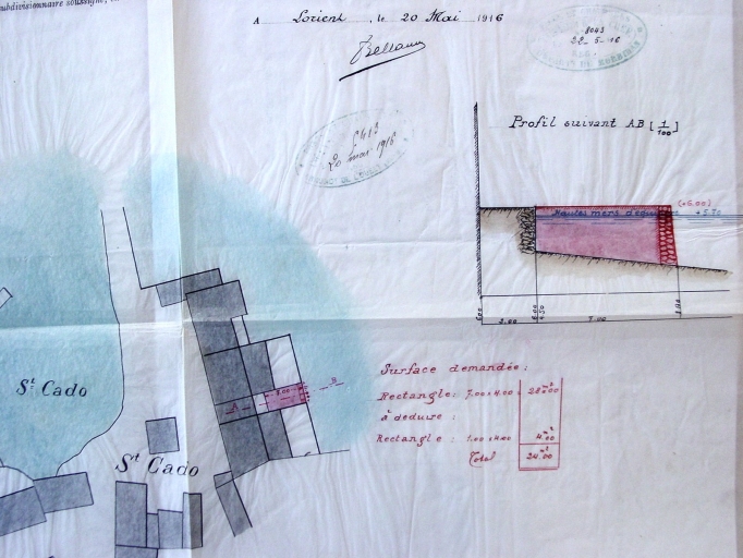 Plan d'une concession sur DPM à Saint-Cado en 1916, avec profil du terre-plein autorisé.Immatriculation