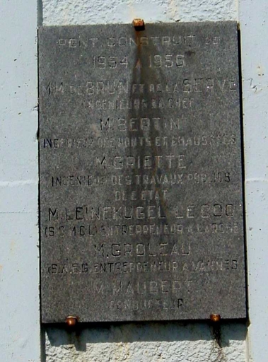 Plaque inaugurale listant les corps d'Etat et entreprises ayant participé à la reconstruction du pont entre 1954 et 1956.Immatriculation