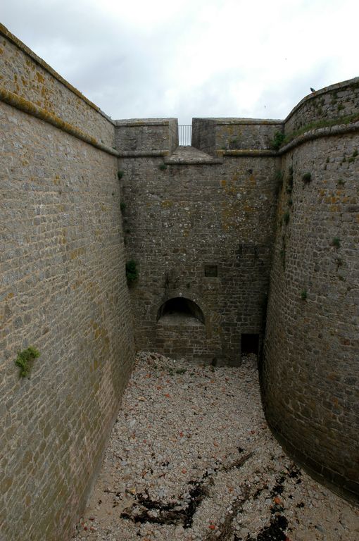 Vue de la citadelle de Port-Louis : embrasures nord protégées par l'orillon du bastion Dumourier et flanquant la porte du corps de placeImmatriculation