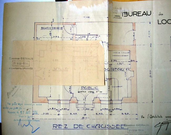 Plan du rez-de-chaussée, signé Edmond Gemain, architecte à Vannes, 1934Immatriculation