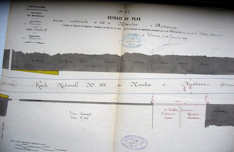 8 janvier 1885. Demande de M. Labaraudrie pour M. Victor, entrepreneur de serrurerie, pour construire une maison sur la RN 165, rue de Nantes. Plan. AD Morbihan S 246.Immatriculation