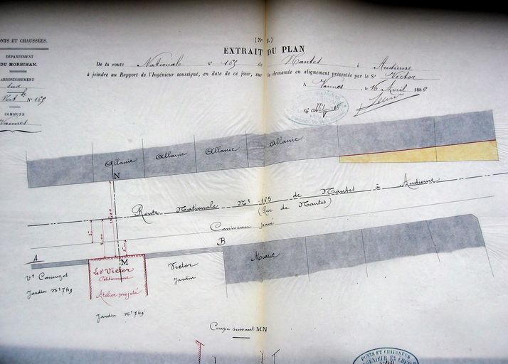 16 avril 1886. Demande de M. Victor pour construire un atelier sur la RN 165, rue de Nantes. Plan. AD Morbihan S 246.Immatriculation