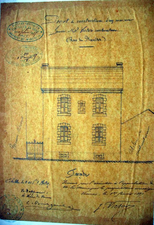 4 janvier 1887. Demande de M. Victor, entrepreneur de serrurerie, pour construire une maison sur la RN 165, rue de Nantes. Elévation. AD Morbihan S 246.Immatriculation