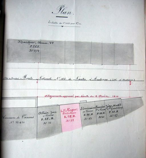 Demande d'alignement de Jabaud aîné, entrepreneur de T.P., pour le sieur Roger, armurier pour démolir et reconstruire une maison, 6 rue d´Auray, près du nouvel hôtel de ville, 10 juillet 1888 ; cadastre 1844, K 42, détruit . AD Morbihan, S 246.Immatriculation