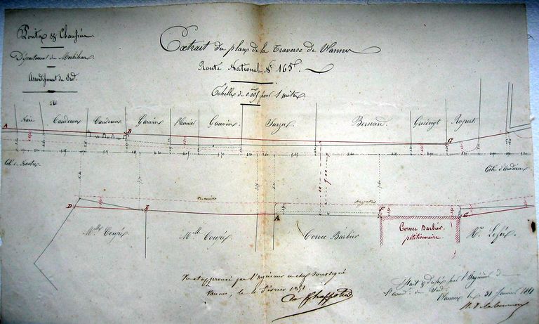 Demande de Corvec Barbier pour établir un trottoir devant la façade de leur maison rue du Mené. Plan, 14 janvier 1851. AD Morbihan S 245 alignements 1820-1880.Immatriculation