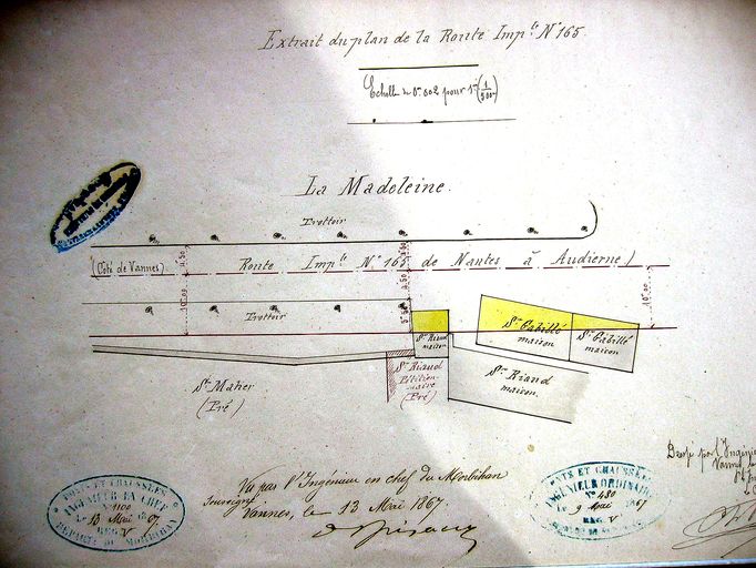 Demande du sieur Rio pour faire reconstruire une maison à La Madeleine . Plan, d'alignement, 18 mars 1867. AD Morbihan S 245.Immatriculation