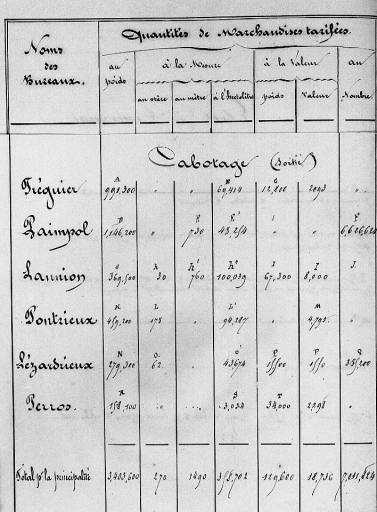 Etat du mouvement commercial en 1852 pour les bureaux de la principauté de Tréguier, dont Perros-Guirec (AD 22)Immatriculation