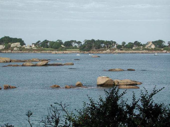 Le rocher La Bergère en 1er plan et à g. Karreg Trezenn ar Raeed (la Roche de la Plage de sable des Raies) : plateau rocheux au nord de la presqu'île de Ti-NewisImmatriculation