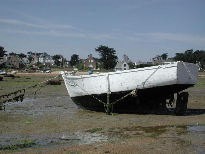 Bateau de pêche plaisance non ponté, de construction Le Flem, sur la Grève Blanche (Trégastel) : remarquer les formes plus trapues de cette coqueImmatriculation