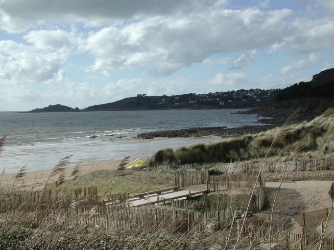 Vue des aménagements récents pour protèger la dune en arrière de la plage de Goas LagornImmatriculation