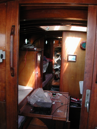 Vue des parties endommagées à l'intérieur : infiltration d'eau douce au niveau des cloisons en cp et dans les cabines (poste du milieu)Immatriculation
