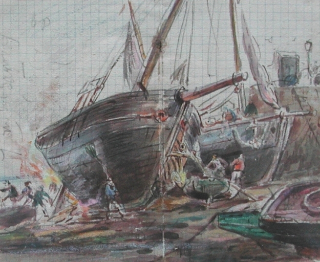 Le brûlage d'une coque avant le passage au coaltar avec le guipon (dessin Faudacq, collection particulière)Immatriculation