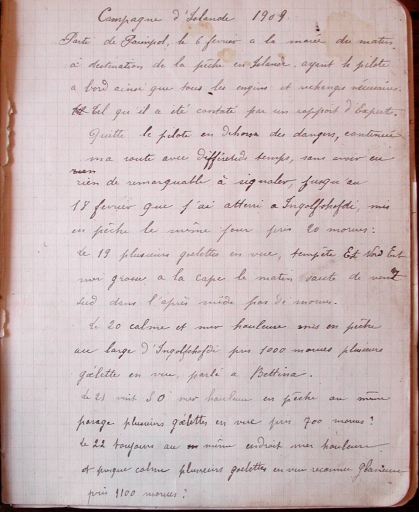 Vue d'une page manuscrite du livre de bord, datée de la campagne de 1909 (collection particulière)Immatriculation