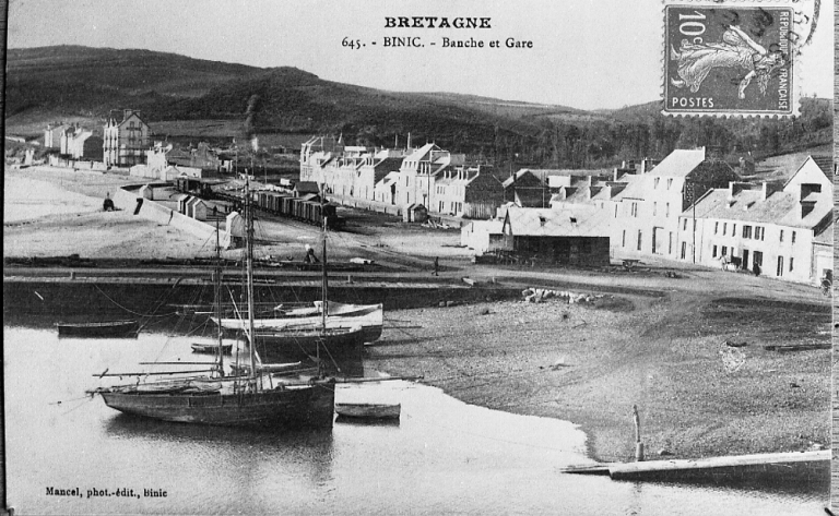 Vue de la Banche, 2ème quart 20ème siècle : remarquer la gare, le mur de défense littorale, saillie, le terre-plein, le dernier atelier et la cale de carénage (AD 22, Fonds Joël)Immatriculation