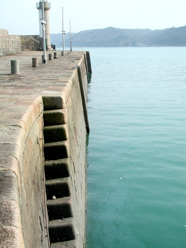 Vue en détail du mur de la jetée, côté avant-port, avec l'escalier : remarquer le fruit peu prononcé du mur du quaiImmatriculation