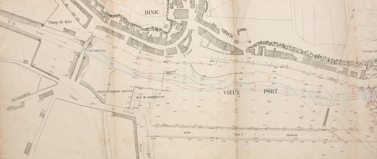 Plan coté du vieux port de Binic, daté du 15 novembre 1906 : remarquer les quais, l'ancien pont métallique, le dépôt d'engrais marins, la vieille cale de construction, la cale de la cloche (AD 22)Immatriculation