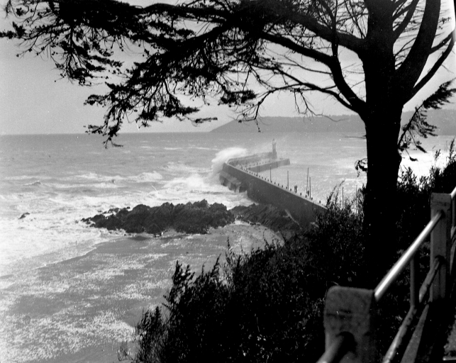 Vue de la jetée de Penthièvre, un jour de tempête, depuis le sentier douanier, vers 1960-70 (AD 22, Fonds Joël)Immatriculation