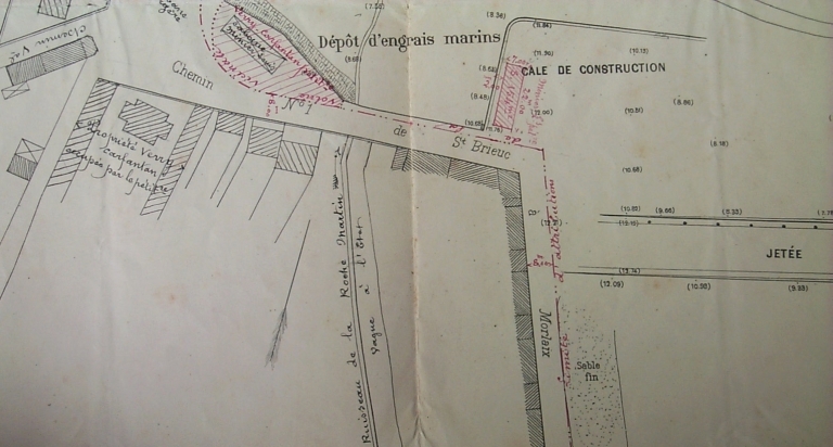 Plan du vieux port de Binic et de la Banche en 1895 : remarquer les dépôts de les, les concessions des artisans et la cale de construction (AD 22)Immatriculation