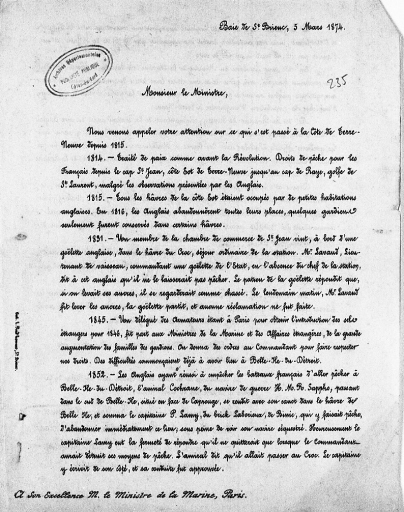 Lettre de protestation des armateurs de la baie de St-Brieuc, datée de 1874, contre la présence anglaise à Terre-Neuve, avec la répartition des droits et des lieux de pêche (AD 22)Immatriculation