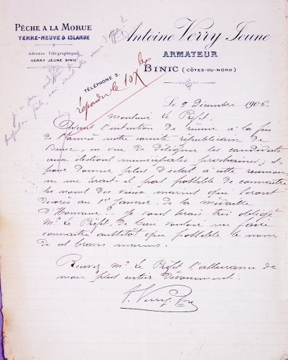 Lettre originale de Antoine Verry jeune pour réunir le comité républicain en vue des élections municipales et de la délivrance de médailles d'honneur aux vieux marins, 9/12:1906 (collection particulière)Immatriculation