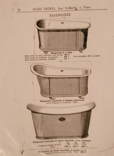 Publicité pour la vente de baignoire : dessins des différents types de baignoire (collection particulière)Immatriculation
