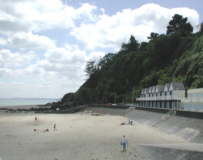 A l'est de la plage : le site de l'école de voile des Roches Brunes, la cale en béton, les nouvelles cabines de bains depuis le parkingImmatriculation