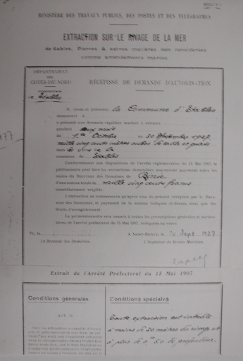 Récépissé d'autorisation pour l'extraction du sable sur les plages d'Etables du 1er octobre au 30 novembre 1927 (collection particulière)Immatriculation