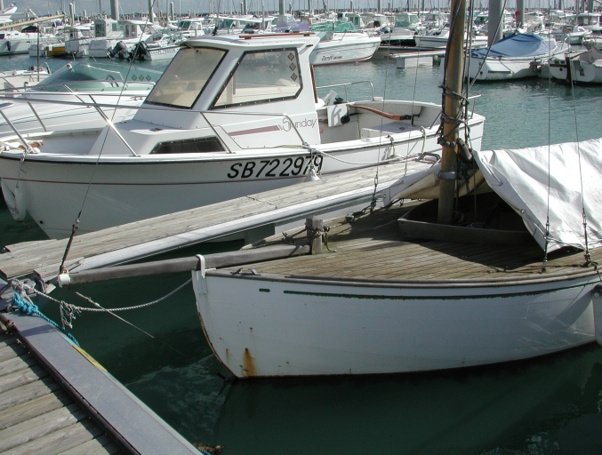 Vue de l'avant : remarquer l'étrave ronde au-dessus de la flottaison et le demi-pontage lattéImmatriculation