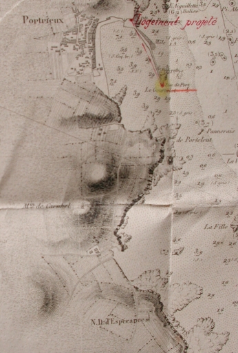 Plan de la rade de Portrieux, levé en 1830 par Beautemps-Beaupré, révisé en 1867 et annoté par Guillomoto en 1897 : projet de logement du gardien du fanal (AD 22)Immatriculation