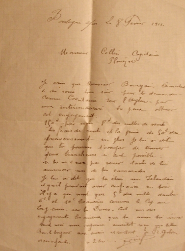 Lettre manuscrite, datée du 8 février 1911, adressée au capitaine Collin de Plouézec par un intermédiaire de Bourgain armateur, qui propose un engagement comme capitaine sur le navire l'Aiglon (collection particulière)Immatriculation