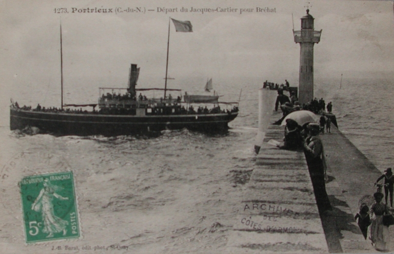 Départ du vapeur Jacques Cartier pour Bréhat : remarquer le parapet et le bout du môle, 1er quart 20ème siècle (AD 22, Fonds Barat)Immatriculation