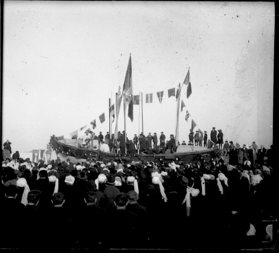 Baptême et mise à l'eau d'un nouveau canot de sauvetage pour la station de St-Quay, au 1er quart du 20ème siècle (AD 22, Barat)Immatriculation