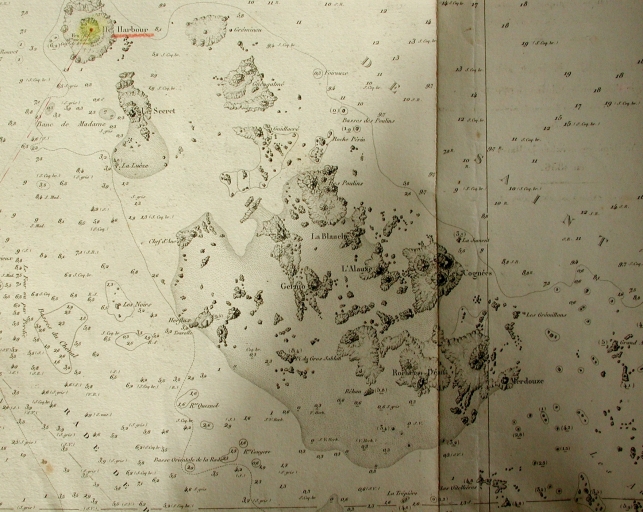 Extrait de la carte n° 833 à l'Ouest de St-Quay : les îles Saint-Quay et l'Île Harbour (AD 22, EPSHOM)Immatriculation