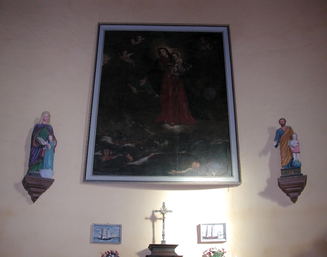 Ex-voto au-dessus de l'autel, dans le choeur : peinture sur toile en souvenir du naufrage du navire La Perle, datée du 19ème siècleImmatriculation