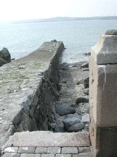 Vue en détail de la cale : remarquer le vaigrage en ciment des moellons de granite et les marches d'accès à la grèveImmatriculation