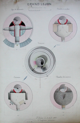 Dessin aquarellé : Coupe de la cuisine, de la terrasse et des chambres, 1885 (AD 22)Immatriculation