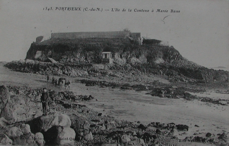L'île de la Comtesse à marée basse, 1er quart 20ème siècle : remarquer le vivier et la charrette de goémon (Barat, collection particulière)Immatriculation
